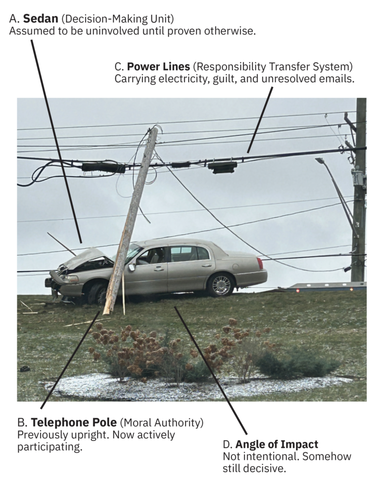A fully hands-off shutdown protocol in which you refuse to click “Shut Down” and instead wait for infrastructure to collapse on your behalf. Somewhere, eventually, a sedan makes a decision. Your computer complies.