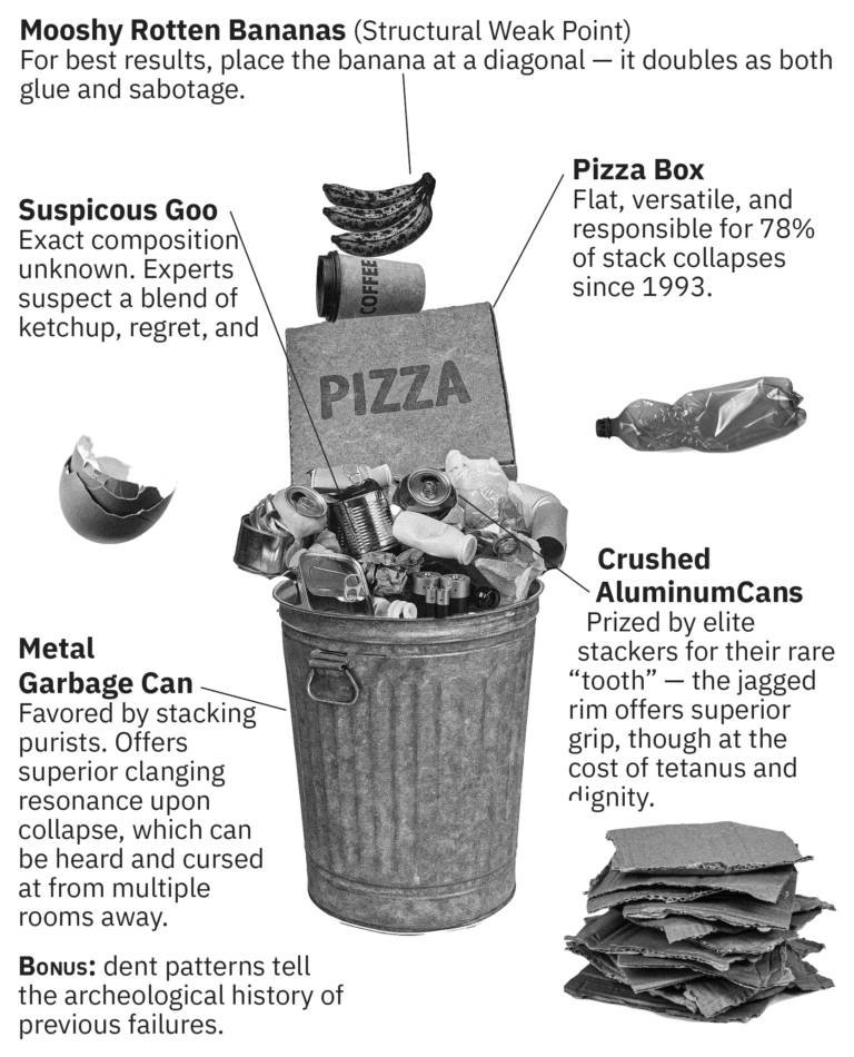 Trash Stacking (aka Garbage Jenga) is the high-stakes leisurly pursuit of seeing how much waste you can balance on top of a full trash can without technically “taking it out.”